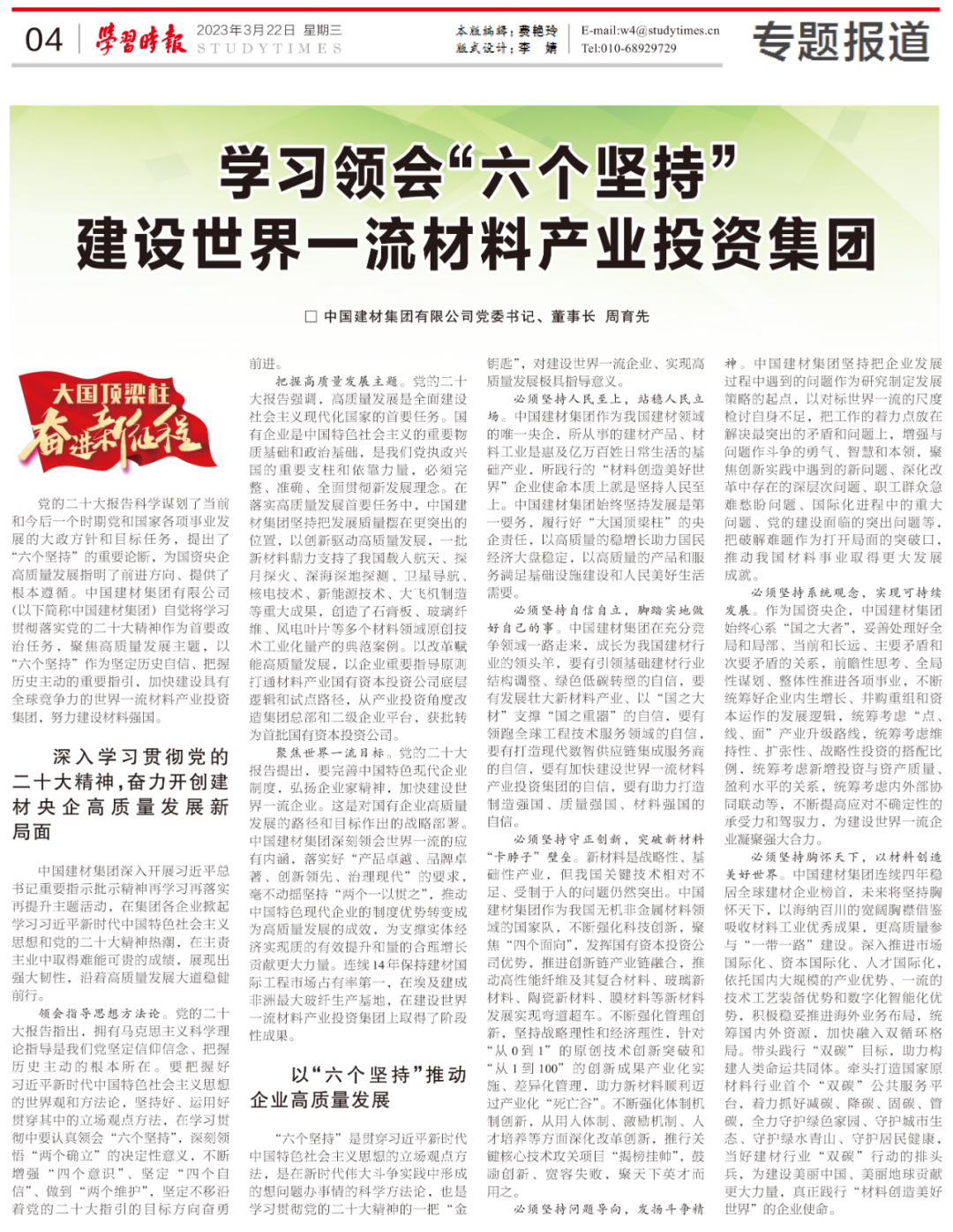 近日,《學(xué)習(xí)時報》“大國頂梁柱 奮進(jìn)新征程”專欄刊發(fā)了中國建材集團(tuán)黨委書記、董事長周育先署名文章。文章聚焦高質(zhì)量發(fā)展主題,以“六個堅持”科學(xué)方法論指引我們加快建設(shè)世界一流材料產(chǎn)業(yè)投資集團(tuán),努力建設(shè)材料強國。